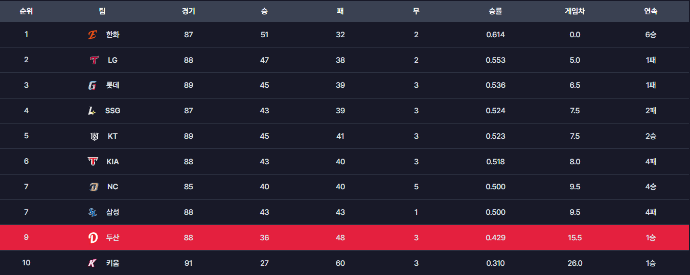 전반기 두산베어스 순위