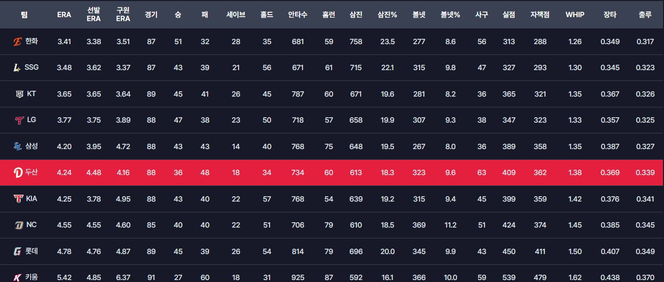 전반기 두산베어스 투수력 순위