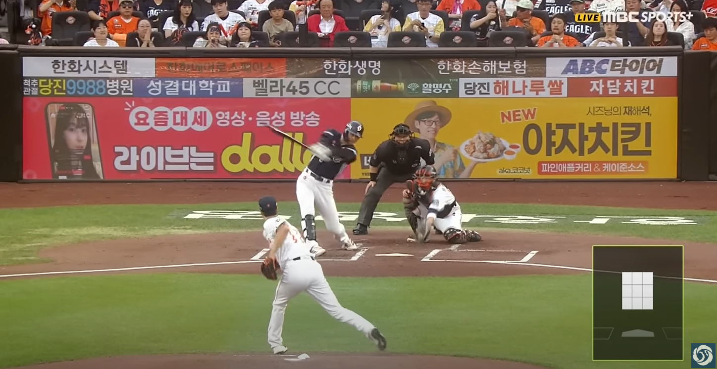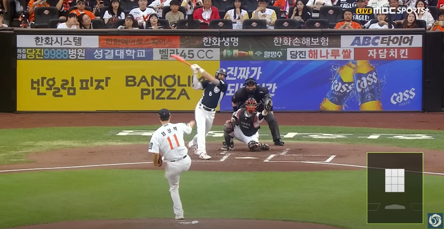 - 1회말 한화 노시환이 잭 로그의 스위퍼를 받아쳐 좌월 투런 홈런을 터뜨리며 곧바로 2-2 동점을 만들었습니다.
