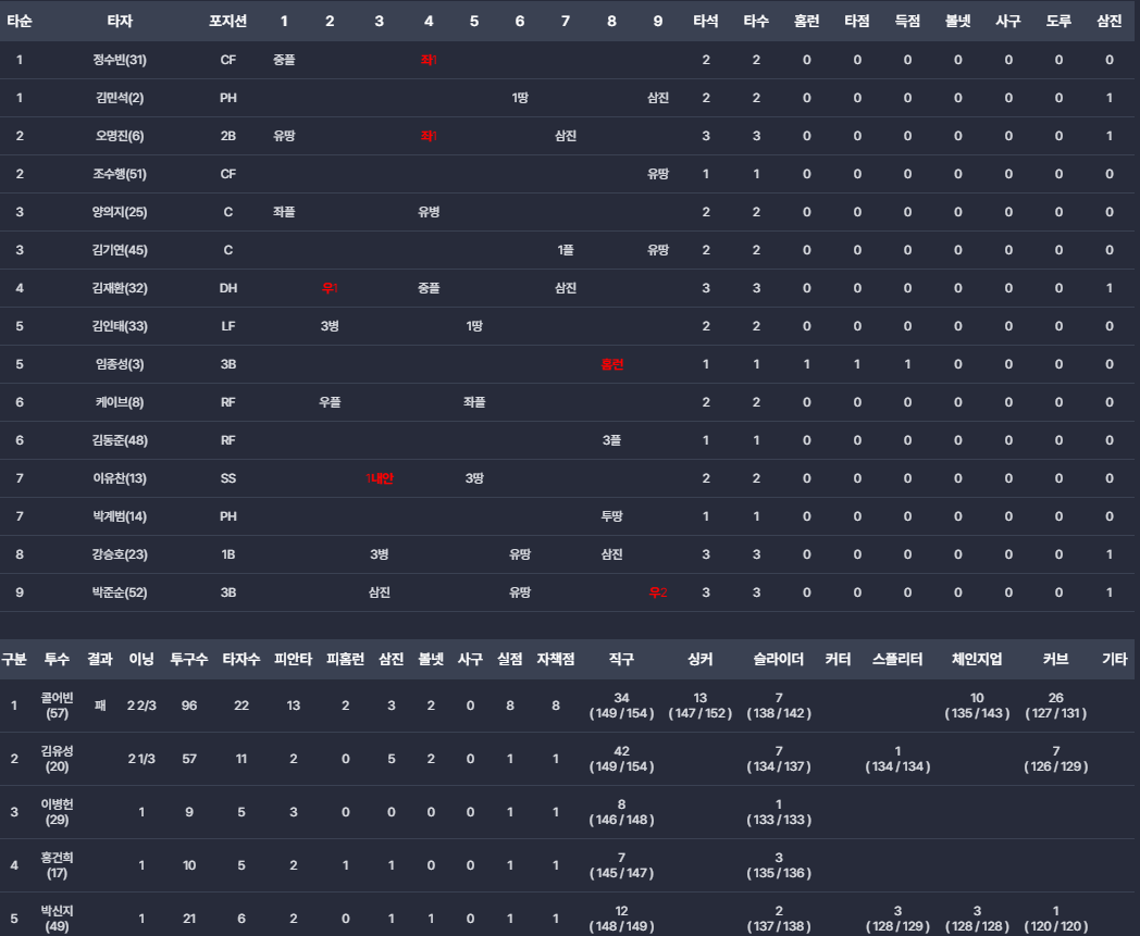 - 콜 어빈(선발): 2⅔이닝 8실점으로 조기 강판, 경기 초반 대량 실점의 빌미를 제공했습니다.