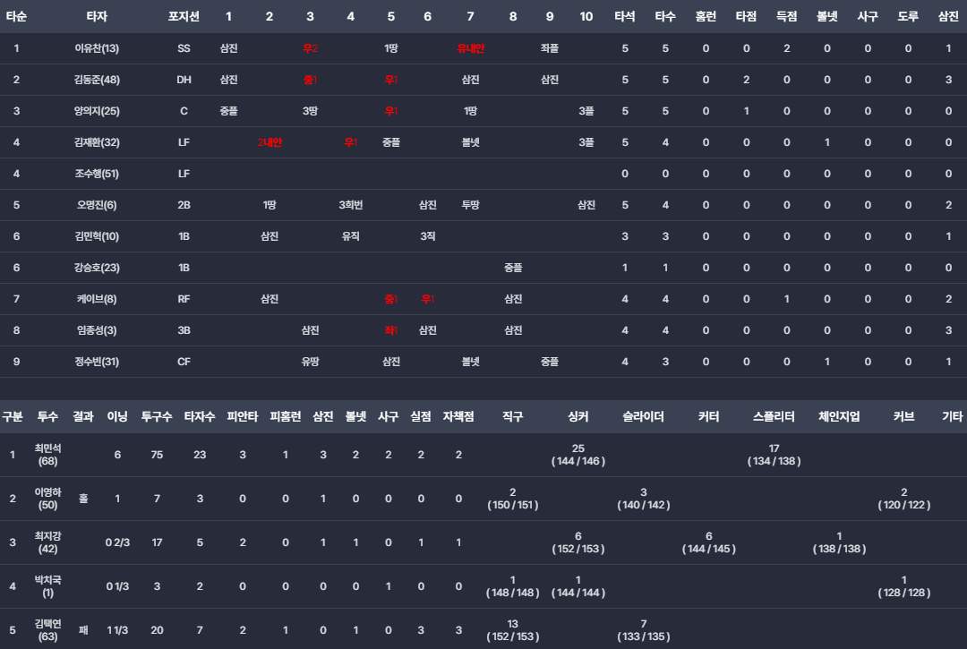 - 타선은 5회초 이후 추가 득점에 실패하며, 리드를 지키지 못하는 흐름이 반복됐습니다.