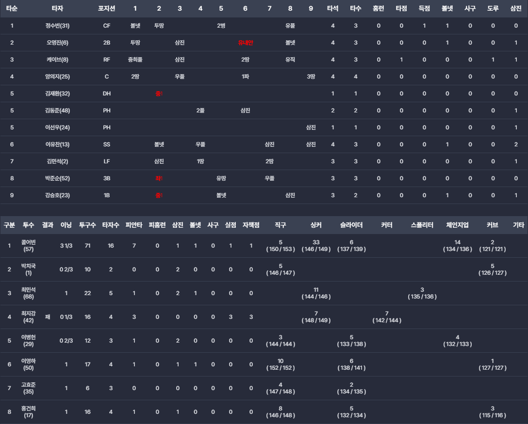 - 최지강: 6회 등판해 ⅓이닝 3피안타 3실점, 불펜 불안으로 역전 및 추가 실점 허용