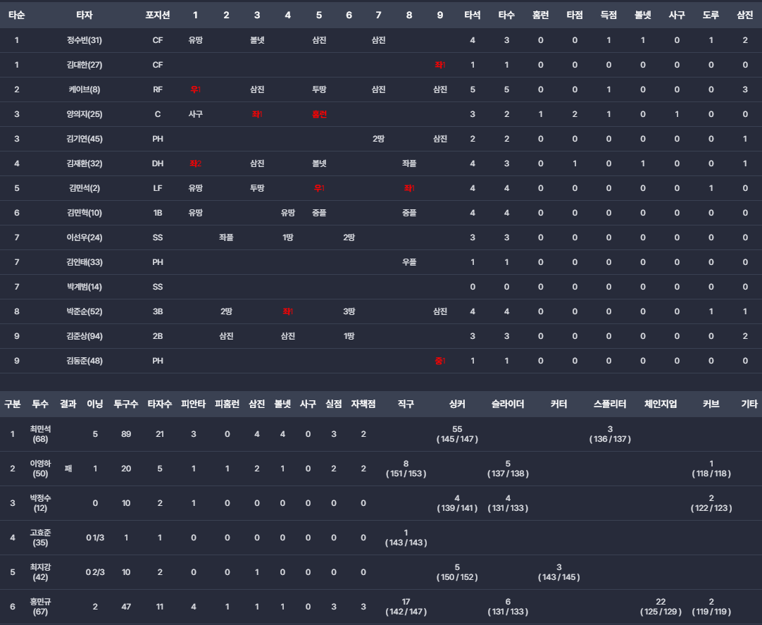 - 최민석: 선발로 5이닝 3실점(비자책점 포함)으로 비교적 잘 버텼습니다.
