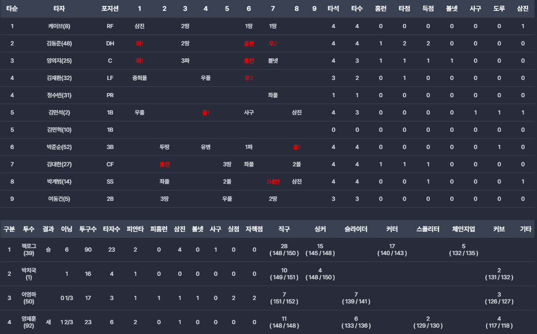 - 김동준: 데뷔 첫 홈런 포함 3안타 2타점 맹타, 1회 선취점, 6회 솔로홈런, 7회 쐐기 2루타로 팀 공격을 이끌었습니다.