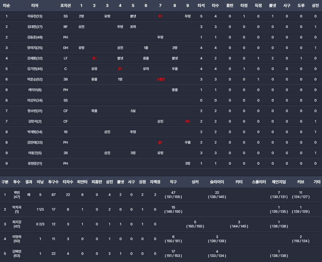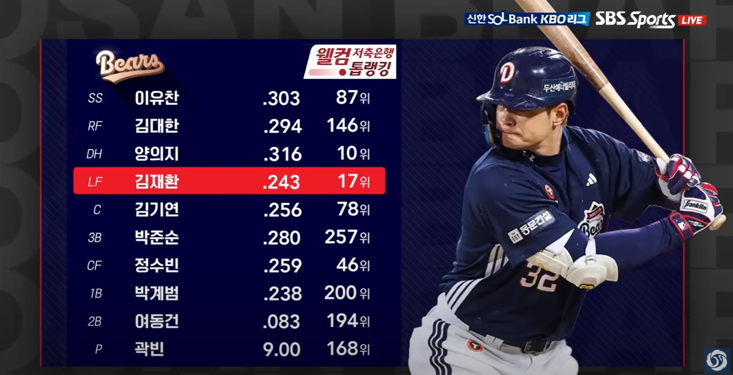 - 김재환: 4타석 2타수 1안타 2볼넷, 두로와 득점 등 중심타자로 역할을 했습니다.