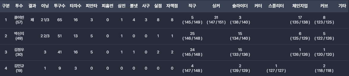 - 2차전 - 콜어빈: 상대의 자멸하는 실책으로 1히 4점을 얻은 상태에서 에이스의 투구는 너무나도 아쉬었습니다. 긴장이 너무 풀어진건지...여유를 갖지 못한채 좌우로 벗어나는 제구력으로 사사구후에 가운데 들어가는 공으로 적시타의 반복으로 8실점하며 무너졌습니다 게다가 투사교체시 보인 행동은 개인적인 감정을 표출하는 것으로 좋지 않은 모습이었다고 봅니다.