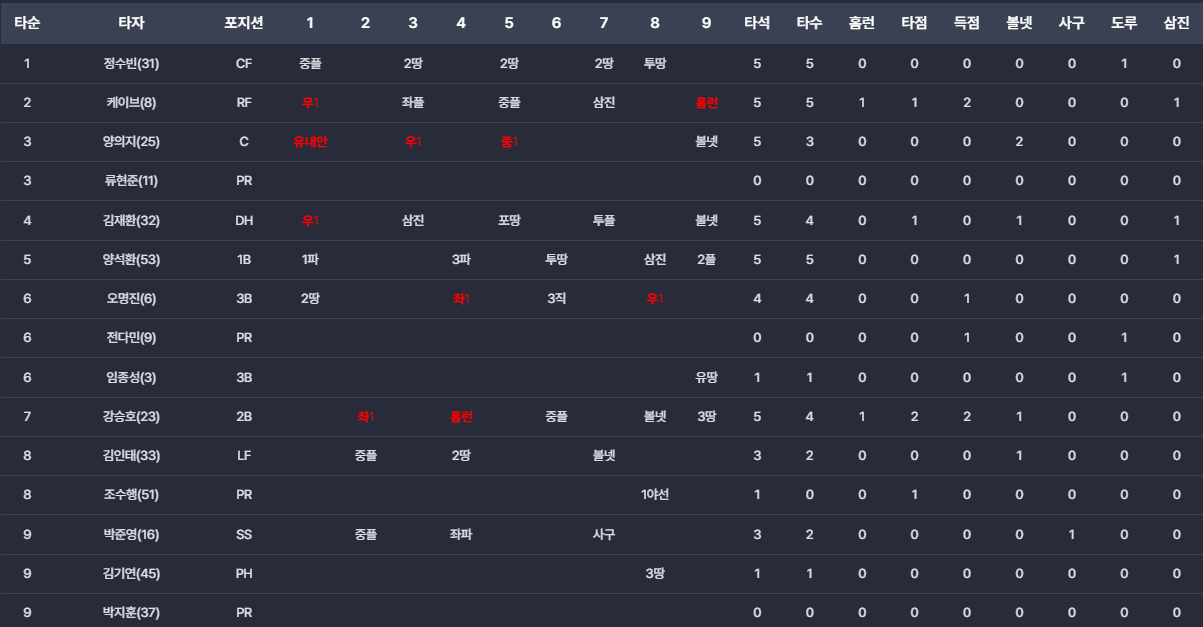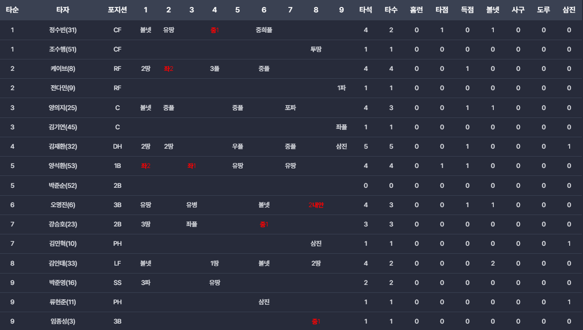 - 2차전 대타 : 6회말 무사 만루에서 박준영 대신 류현준??? 대타가 필요했나??? 대타라면 김민혁이 더 좋은 선택 아니었나??? 개인적으로 이해가 되지 않았던 대타였습니다. 포기하는 대타였다고 밖에...