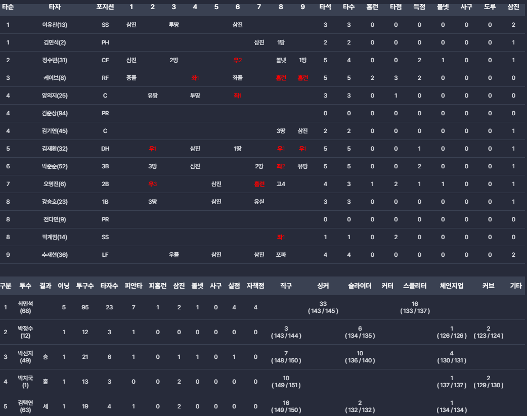 제이크 케이브는 8회초 동점 2점 홈런과 9회초 쐐기 솔로홈런 포함 3안타 3타점으로 팀 역전승의 중심에 섰습니다. 박계범은 8회초 2타점 적시타로 승부를 뒤집는 데 결정적 역할을 했습니다. 박치국은 두산의 믿을맨으로 완벽한 투구를 선보이며 중간 계투에서 계속해서 믿음을 보여주고 있습니다.