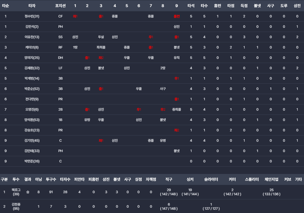 - 선발 잭 로그의 호투: 8이닝 무실점으로 롯데 타선을 완벽히 봉쇄하며 승리의 발판을 마련했습니다.