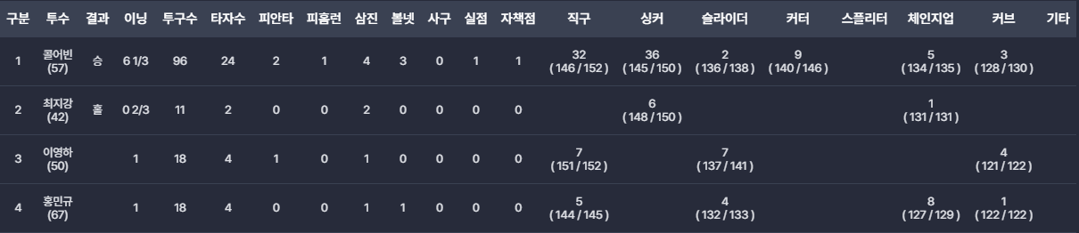 - 콜 어빈: 6⅓이닝 2피안타(1홈런) 3볼넷 4탈삼진 1실점의 퀄리티스타트로 시즌 3승을 기록하며 에이스다운 면모를 보였습니다.