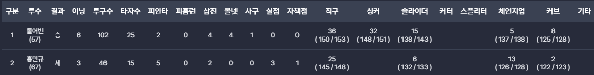 - 콜어빈: 믿고 보는 에이스로 6이닝 2피안타로 무실점 투구를 보여주었습니다. 4사구 5개가 옥의 티입니다.