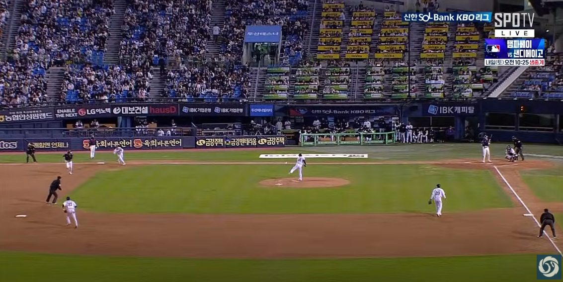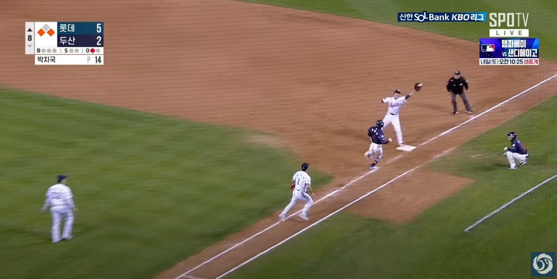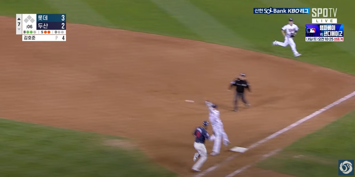 - 주루 미스: 6회말 김재환이 3루코치의 멈춤 사인을 무시하고 홈을 노리다 아웃되며 추가 득점 기회를 날렸습니다. 개인적으로 고토코치의 수신호에 문제가 있었습니다. 2루주자와 1루주자에 대한 구별된 사인이 있어야 했는데, 이미 3루를 거의 다온 김재환에게 동일하게 계속 오른팔로 돌렸기 때문에 멈추기 어려웠을 것이라고 봅니다.