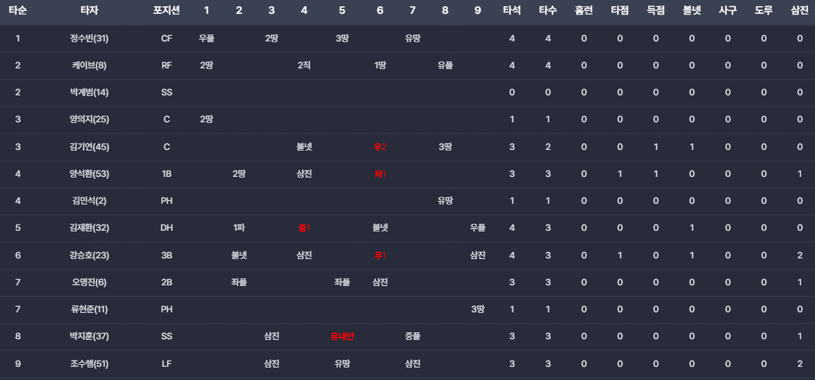 - 득점권 집중력 부족: 6회말 1점차로 따라붙을 기회에서 주루사와 후속타 불발로 흐름을 이어가지 못했습니다.