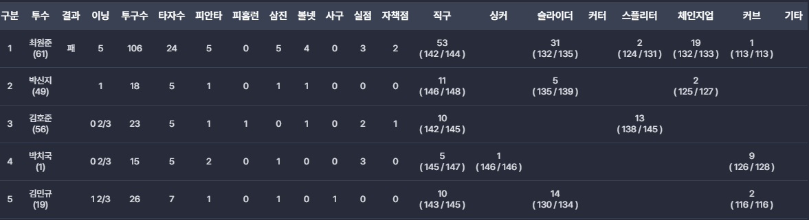 - 경험 부족과 불안한 제구: 신인과 젊은 투수들이 중용되고 있으나, 경험 부족과 제구 난조로 인해 중요한 순간마다 무너지는 모습이 반복되고 있습니다.