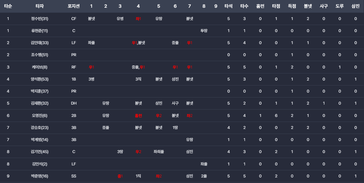 - 케이브: 멀티히트와 주루, 득점 등으로 타선을 이끌었습니다.