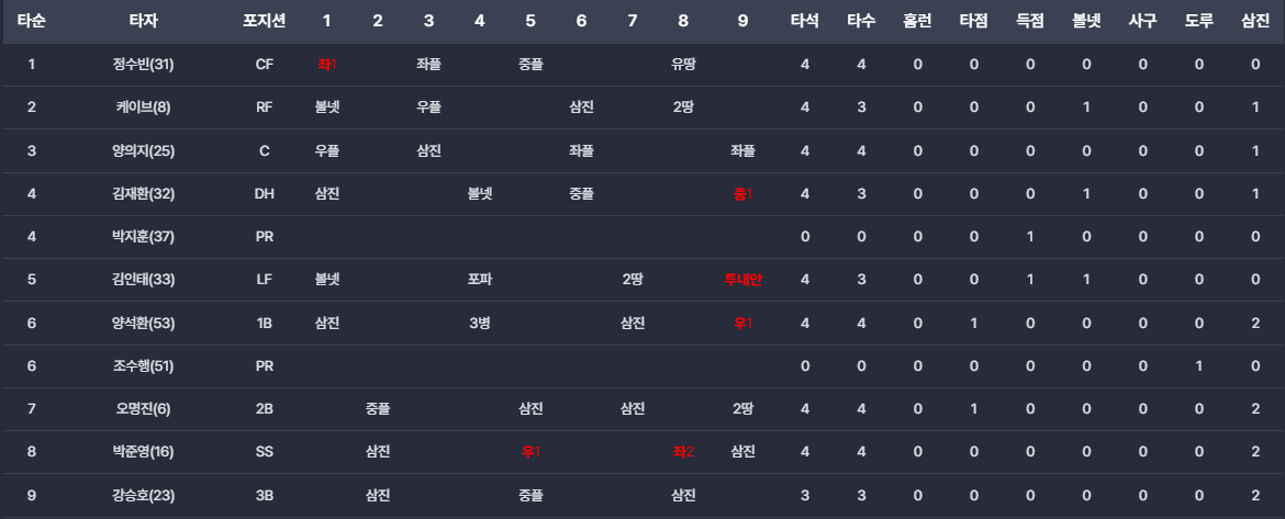 - 9회 추격: 9회 두산은 연속안타로 박영현을 흔들면서 2점차 까지 따라갔지만, 후속타 불발로 동점에 실패했습니다.