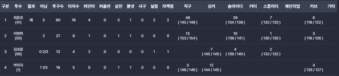 - 최준호: 비록 패대기가 있었지만, 2실점 90개의 투구를 보여준 최준호 선수가 29일 경기의 위안입니다.