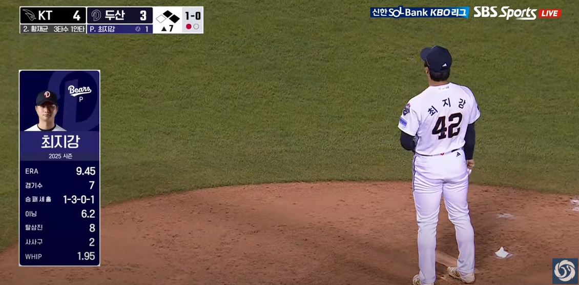 - 7회초 대량 실점: 4-3으로 KT가 앞서던 7회초, 두산은 불펜 교체 이후 연속 안타와 사사구, 그리고 로하스의 2점 홈런을 허용하며 한 이닝에 4실점, 점수 차가 8-3으로 벌어지며 사실상 승부가 결정됐습니다.
