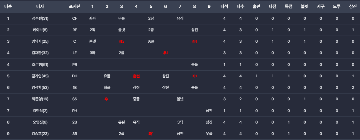 - 김기연: 4회말 시즌 첫 홈런을 포함해 장타로 추격의 불씨를 살렸습니다.