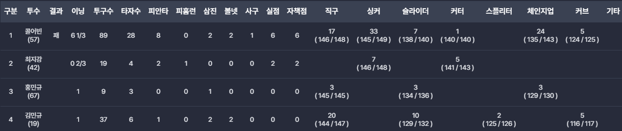 - 선발 콜 어빈: 믿고 보는 콜어빈...빠른 승부를 한다는 것을 상대팀에게 간파당하여 초반 4실점으로 경기 흐름을 내줬습니다.