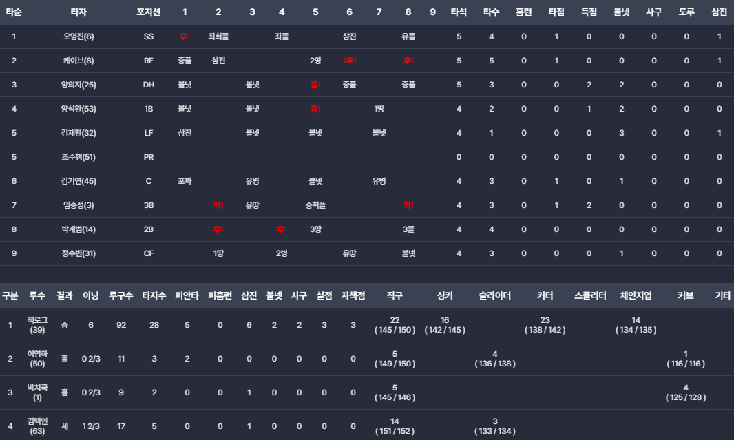 - 승부처: 5회말 1사 만루에서 김기연의 밀어내기 볼넷으로 동점을 만들고, 이어 임종성의 희생플라이로 역전에 성공하며 4-3으로 앞서나갔습니다. 8회말 케이브의 적시타로 쐐기점을 추가했습니다.