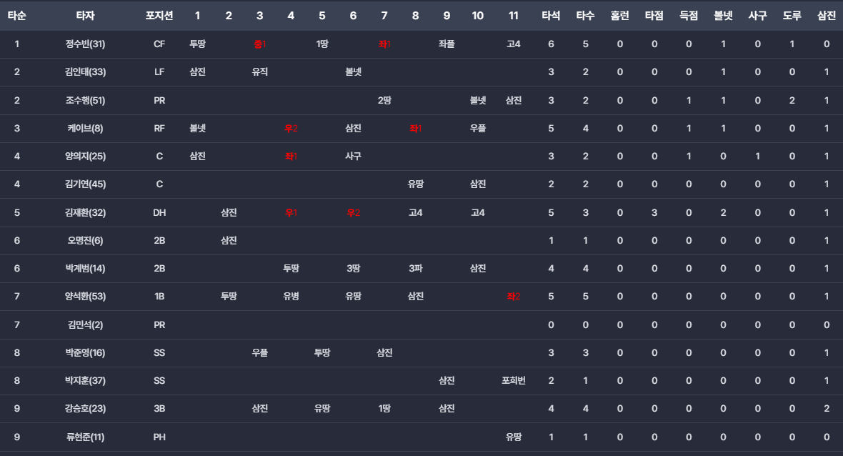- 연장 11회말 끝내기 기회 무산: 11회말 1사 3루 끝내기 찬스에서 류현준과 조수행이 범타와 삼진으로 물러나며 경기가 그대로 종료됐습니다.