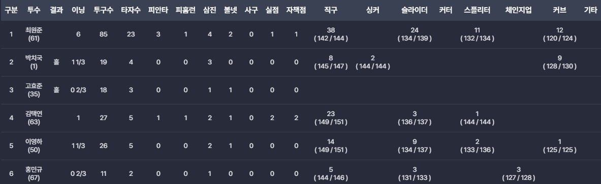 - 최원준: 선발로 6이닝 1실점 호투하며 팀에 승리의 발판을 마련했습니다.