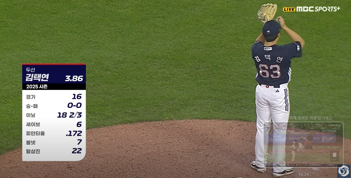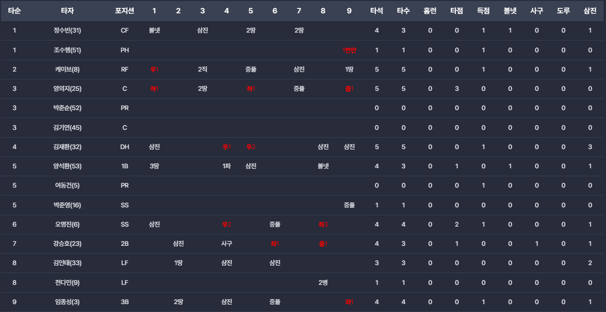 - 8회초 쐐기점: 3-1로 앞선 8회초, 오명진의 3루타와 강승호의 적시타로 2점을 추가하며 점수 차를 5-1로 벌려 사실상 승부를 결정지었습니다.