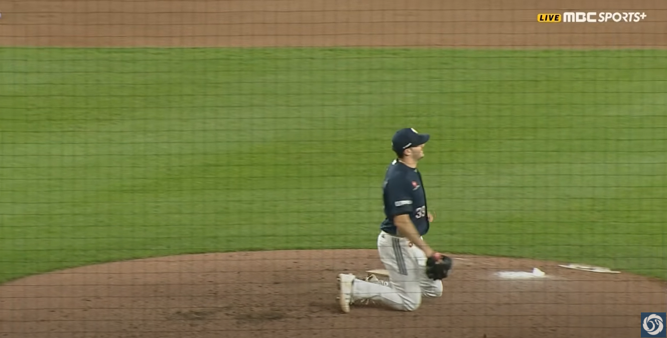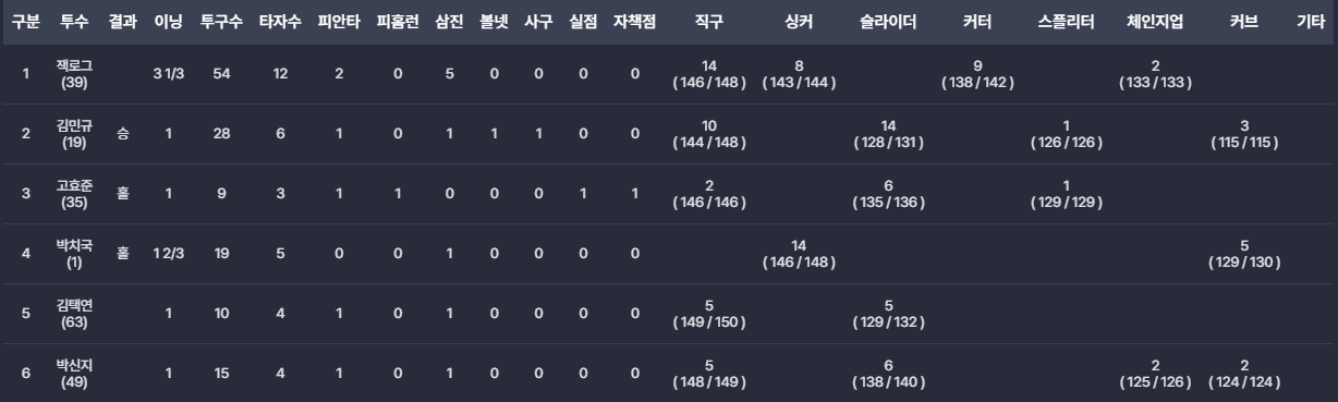 - 최근 6이닝이상을 책임져주고 있는 선발 잭 로그가 3⅓이닝 무실점 호투를 하고 있던 중, 문현빈의 타구에 맞아 부상으로 조기 강판되었습니다. 맞은 후에 표정은 뭔가 심각함을 스스로 인지한듯 한 표정이었는데, 단순 타박으로 확인되어 다행입니다.