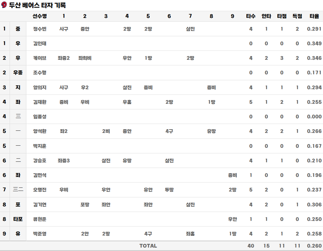 - 김재환: 4회초 투런 홈런 포함 멀티히트로 팀 공격을 이끌며 승부처에서 결정적 역할을 했습니다.