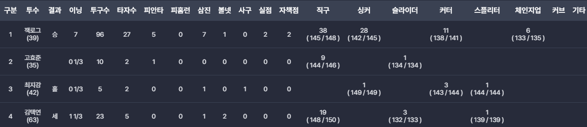 - 잭 로그: 7이닝 5피안타 7탈삼진 2실점(2자책)으로 시즌 2승을 거두며 선발 에이스 역할을 해냈습니다.