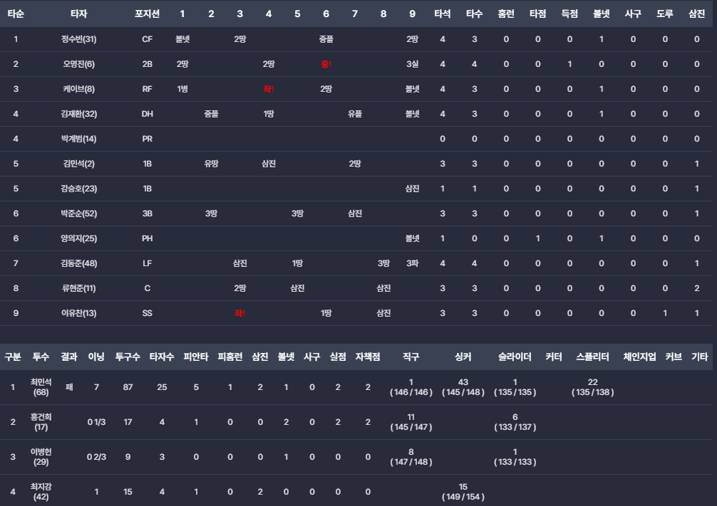 불펜진은 8회 연속 볼넷과 희생플라이로 추가 실점을 허용해 아쉬움을 남겼습니다. 타선 전반 역시 후라도를 상대로 7이닝 동안 무득점에 그치는 등 침묵했습니다.