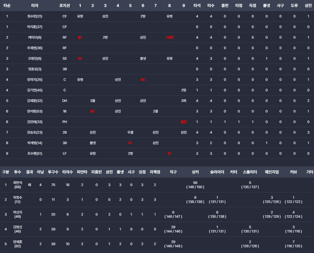 - 최민석: 2회초 제구 난조와 수비 불안에 흔들리며 조기 강판됐습니다.