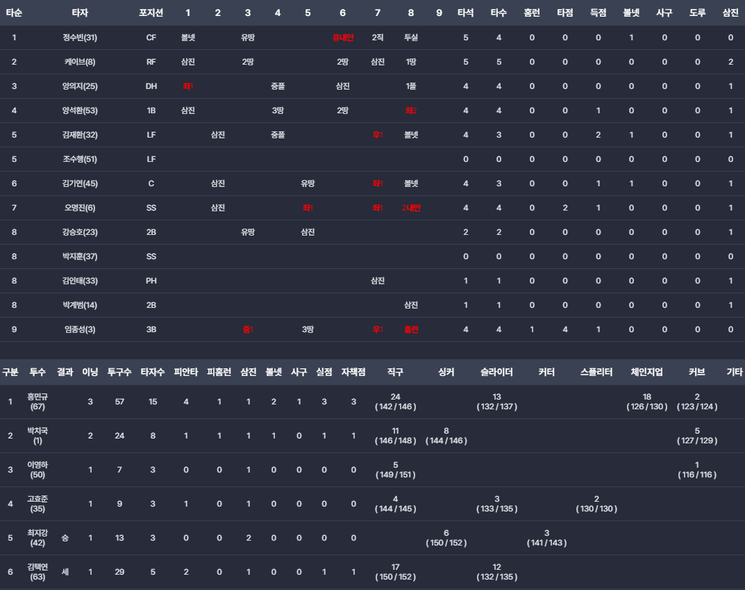 - 임종성: 4타수 3안타 1홈런 4타점 1득점. 8회말 역전 만루홈런(그랜드슬램)으로 팀의 5연패 탈출을 이끈 주인공이었습니다.