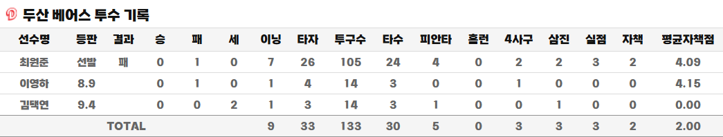 - 최원준: 최원준 690일 만에 QS [7이닝 4피안타 2볼넷 2탈삼진 3실점 2자책]를 기록하며 오랜만에 좋은 피칭을 했습니다. 곽빈이 돌아오기까지 계속 기대해보시죠!