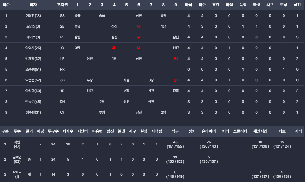 - 곽빈을 앞세운 선발·불펜진의 안정감 : 선발 곽빈 투수가 효과적인 투구수 조절로 7이닝을 막아주며 불펜에 여유를 주는 피칭을 하였습니다.