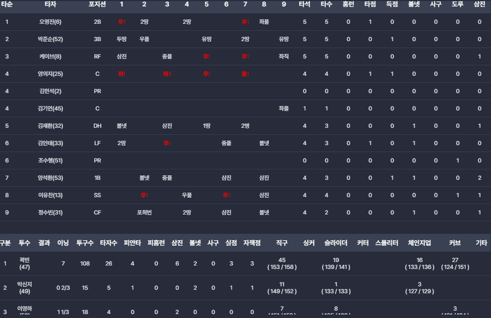 - 선발 곽빈의 호투에도 득점권 찬스 불발과 불펜 난조로 패배