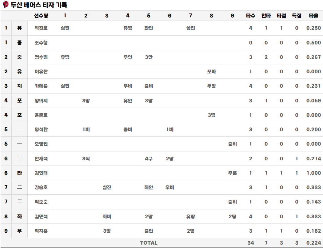 - 양의지: 드디어 내야 안타로 살아날 것 같지만, 본인 스스로 경기하는 모습에 화이팅이 없고, 무거운 분위기를 만들고 있습니다.