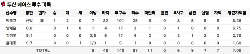 - 잭로그: 왠만해서 잭로그를 콜드로 뽑지 않는데...어제는 뭔가 불편한 모습으로 사사구가 3개 였다는 부분이 이어지는 안타에 실점들이 생겼습니다. 그래도 7이닝 8탈삼진으로 선발의 책임을 다했습니다.