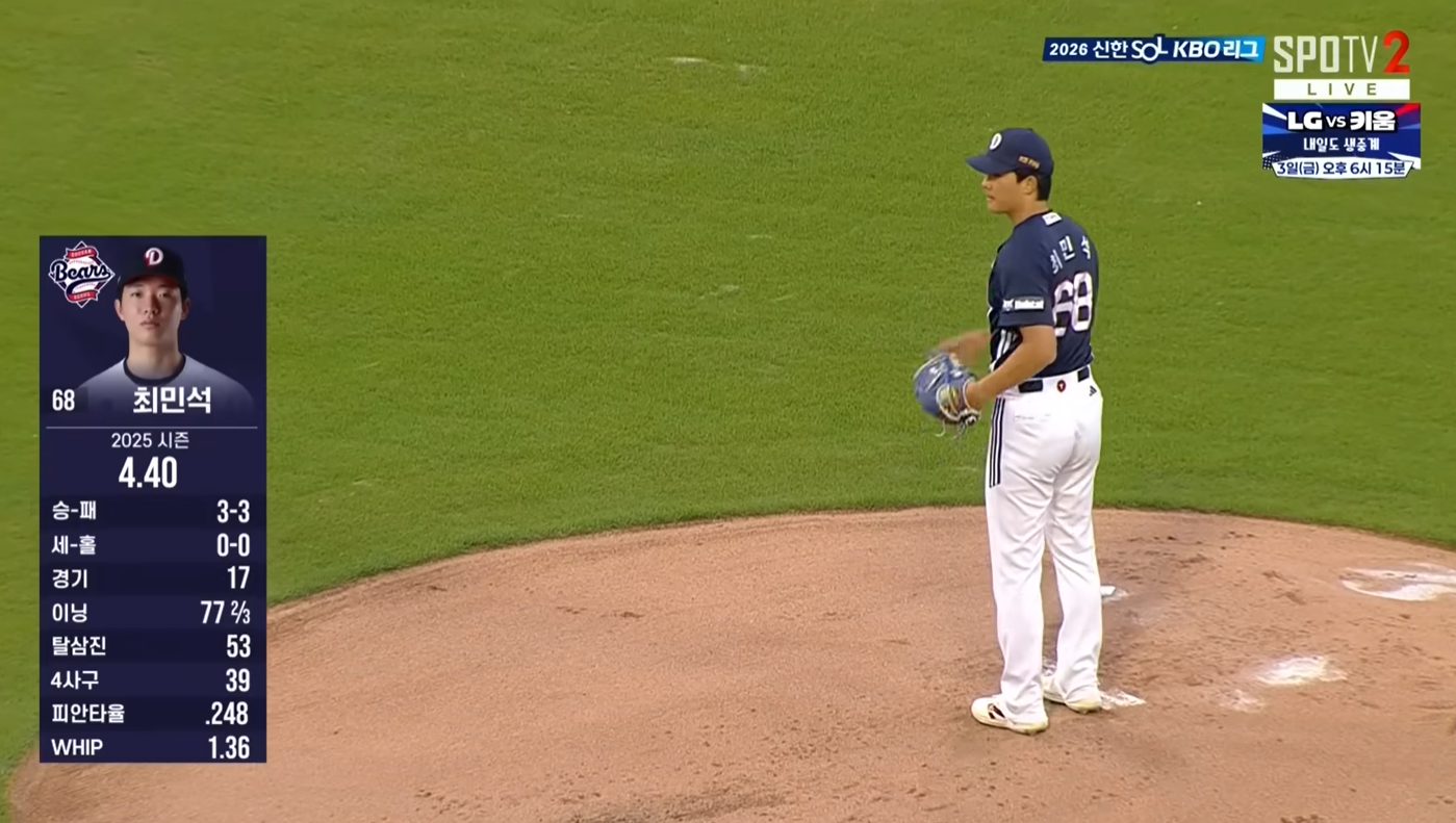 - 선발 최민석: 1회초 수비 실책과 견제 실책으로 실점을 했지만, 6회까지 선발답게 호투를 보이며 5선발 자리를 굳건하게 하였습니다.