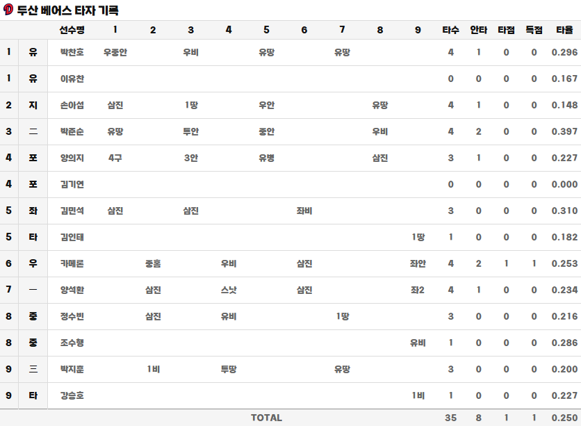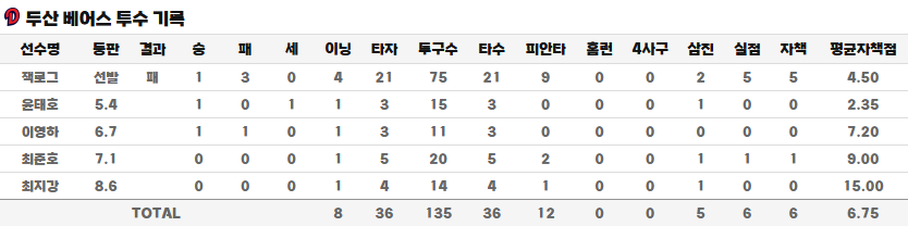 - 두산 불펜진: 잭로그 이후 등판한 불펜투수들이 오랜만에 무사사구 경기를 보여주었습니다. 불펜의 부담이 증가되기는 했지만, 짧은 이닝을 사사구없이 맡아주며 LG와의 3연전에서 좋은 투구를 보여주기를 기대합니다.