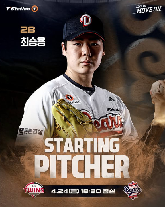 24일 잠실 LG와의 3연전 첫게임 선발은 최승용입니다. 지난 경기만큼 자신감 있도 안정된 투구로 첫게임부터 승기를 가져올수 있도록 응원합니다.