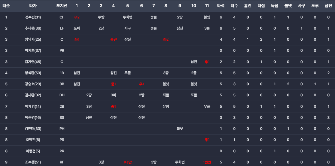 - 최지강: 연장 11회를 무실점으로 막아내며 승리 투수가 되었습니다.