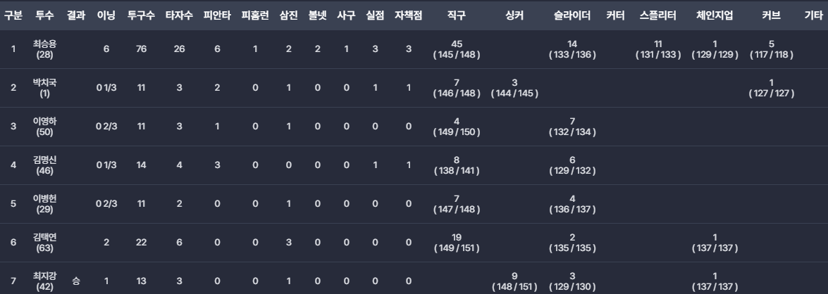 - 초반 실점: 선발 최승용이 1회초 한화 노시환에게 3점 홈런을 허용하며 불안하게 출발했습니다. 그러나, 6회까지 안정적인 투구로 역전할 수 있는 발판의 이닝이터가 되었습니다.