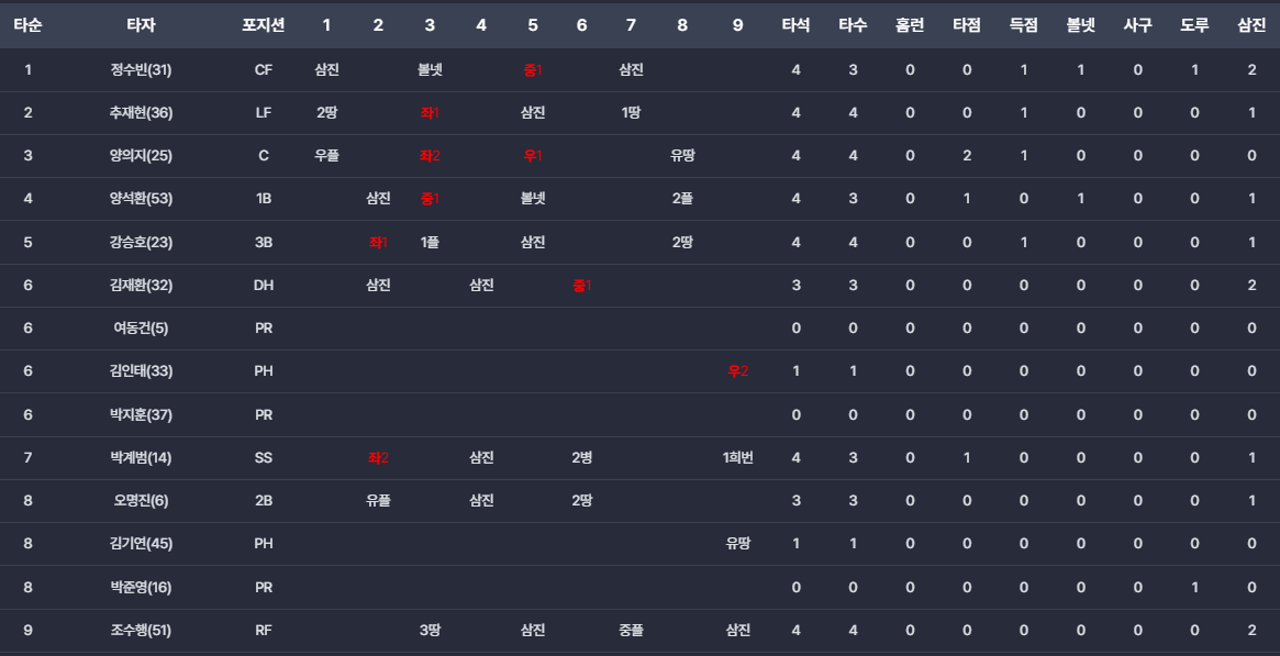- 박계범: 동점 적시타를 포함해 꾸준히 활약하며 타선에 힘을 보탰습니다.