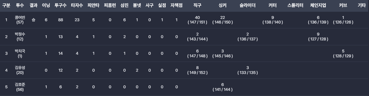 - 콜 어빈: 믿고 보는 선발 투수가 되었네요 . 6이닝 동안 5피안타, 1볼넷, 6탈삼진, 1실점으로 시즌 2승째를 기록했습니다. 타자들의 타격이 살아난다면 "등판 = 승리"가 될것 같습니다.