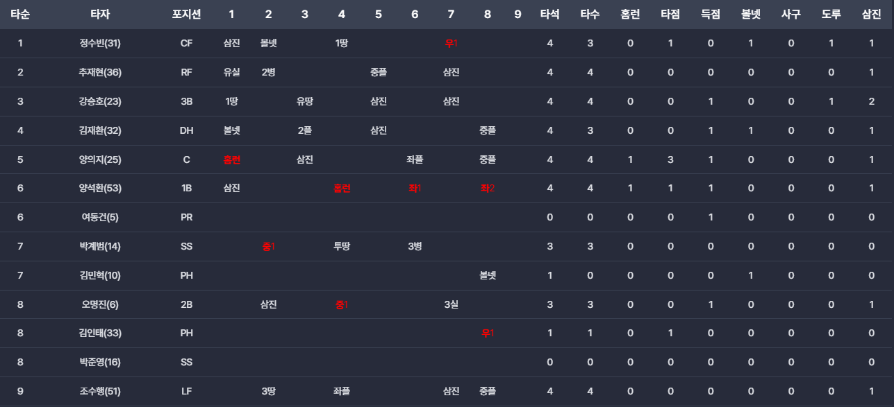 - 4회말 양석환의 솔로 홈런: 양석환이 시즌 2호 홈런을 기록하며 점수 차를 더욱 벌렸습니다.