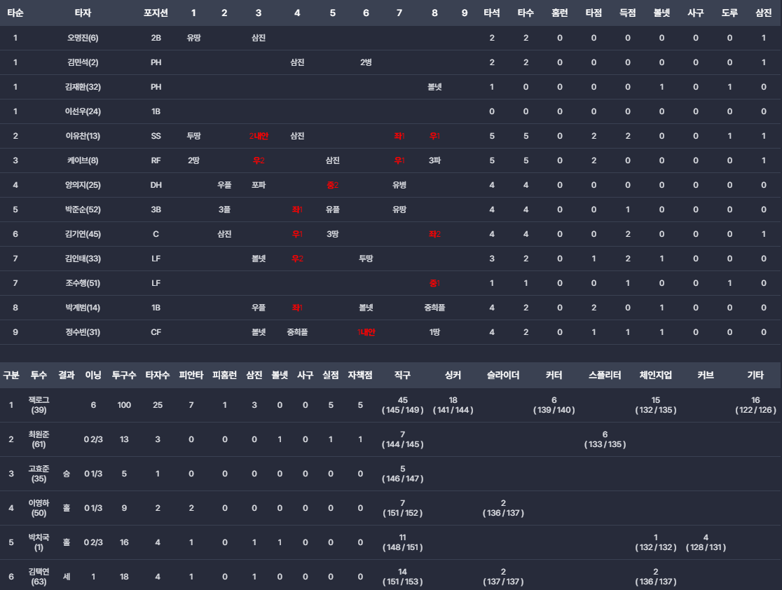- 정수빈: 9번 타자로서 역전 타점을 기록하며 승리의 결정적인 역할을 했습니다.